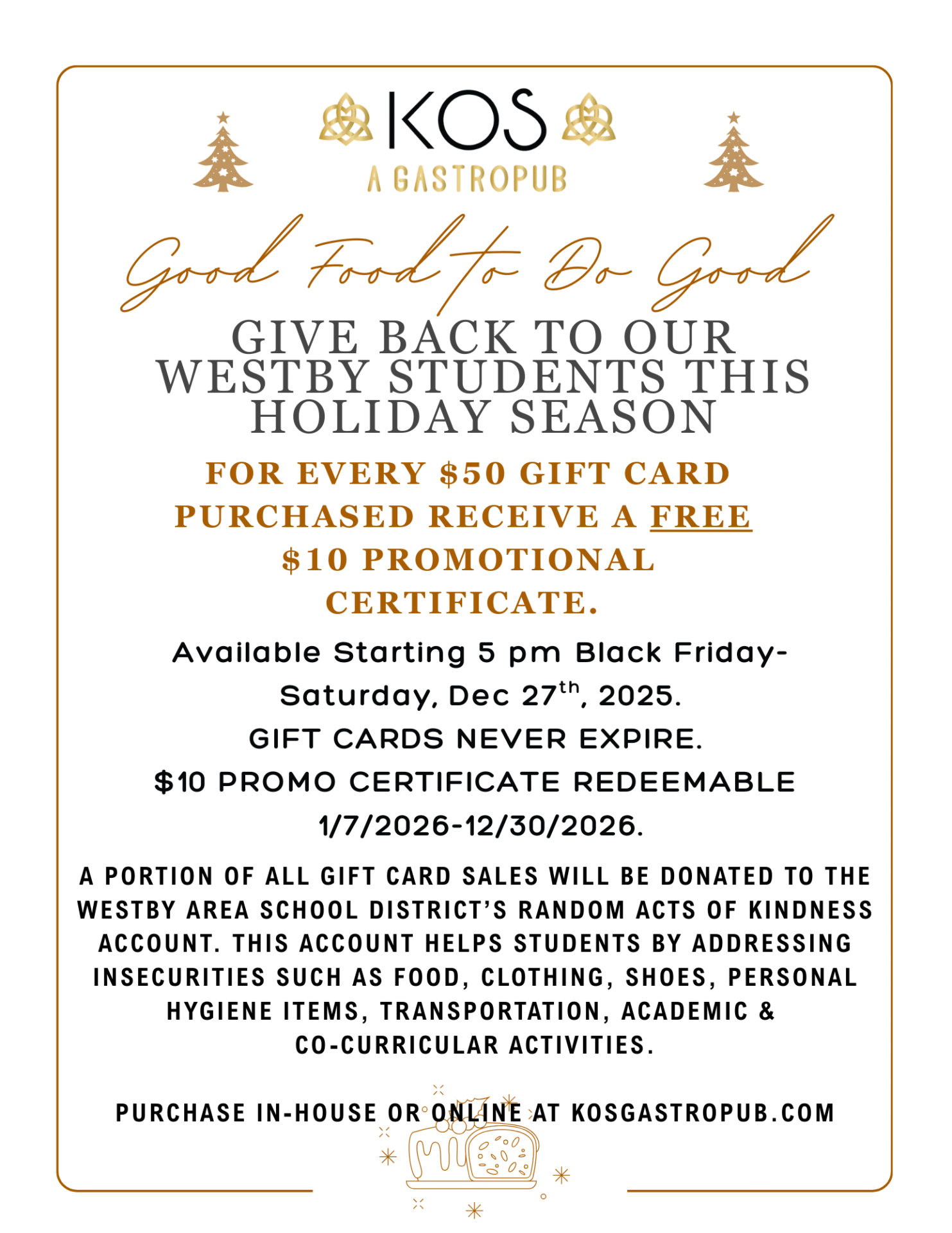 Now through Dec 27th, 2025 “Good Food to Do Good” Gift Card Promotion! For Every $50 Purchased Get a $10 Promotional Certificate FREE!